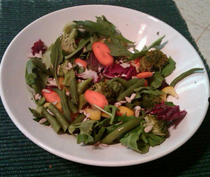 Today when I was eating my lunch salad, I started thinking about why I hate eating restaurant salads. I am usually disappointed in my salad when I order it. Say I go out for lunch with one of my friends and we both want to eat healthy foods, so we look over the salad menu. I scour it to find a salad that has the widest variety of vegetables in it. If I am lucky I find a salad that has a few asparagus tips, a sprinkling of red pepper slices or a nicoise salad with some nice green beans. Most of the time I find salads with lettuce, tortilla strips, grated cheese and sour cream. Not too healthy!!